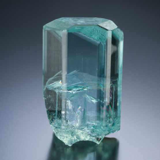 Gem-quality aquamarine from Pakistan. The well-formed prismatic hexagonal crystal is terminated and slightly striated.