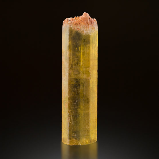 This single beryl crystal of the rare and natural variety known as heliodor is of exceptional quality with a rich golden colour and good transparency.
