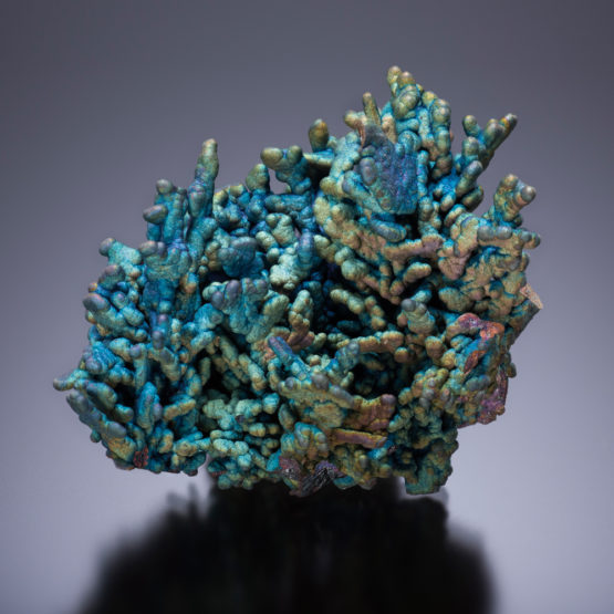 Elongated, bubbly habit of chalcocite that has been coated with iridescent chalcopyrite. This specimen comes from a ‘one-time find’. Specimens from the unique find did include growths of djurleite, also coated in chalcopyrite.