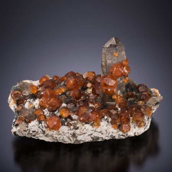 Well-developed lustrous and transparent trapezohedral spessartine garnet crystals with transparent smoky quartz on matrix.