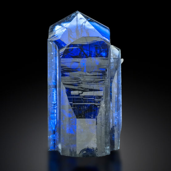 “The Two Princesses” – A masterpiece. This is arguably the best single crystal of tanzanite, a variety of zoisite. This exceptionally large twin crystal is measured at 1,100 grams and is 18cm tall. The gemmy crystal is undamaged, has not been repaired or heated and shows perfect crystal termination. During the Munich show of 2015, “The Two Princesses” was displayed in a featured exhibition of the world’s top 50 mineral specimens.